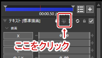 「上のオブジェクト」をタイムラインから選択し、オブジェクト設定の上側にあるハサミのマークの部分をクリックする。