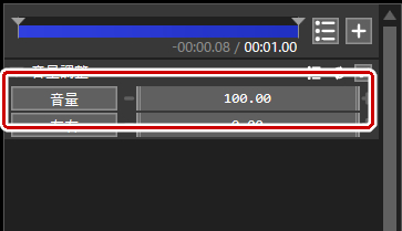 編集レイヤー(タイムライン)上から音量を調整したい動画または音声オブジェクトを選択し、ダイアログの「音量」部分から音声を指定する。