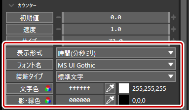 カウンター・タイマーの速度を変えたい場合は「速度」の値を変更する。速度が1.0の場合、カウンターだと1秒ごとに1ずつカウントアップし、タイマーは等速で時間が進む。速度が負の値だと逆再生になり、初期値からカウントダウンとなる。