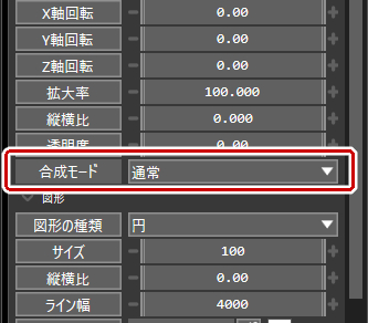 合成モードを利用する場合はオブジェクト設定の「合成モード」の右の部分からモードを選択する。
