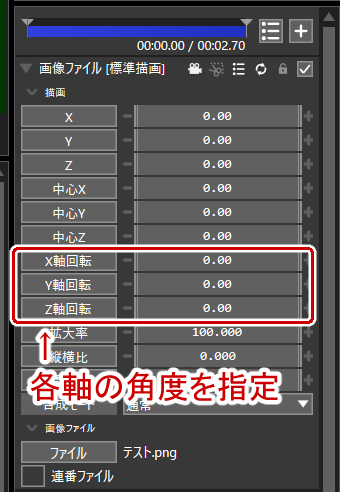 画像を回転させたい場合はオブジェクト設定の「X軸回転」「Y軸回転」「Z軸回転」の値を変更する。値は角度(°)。